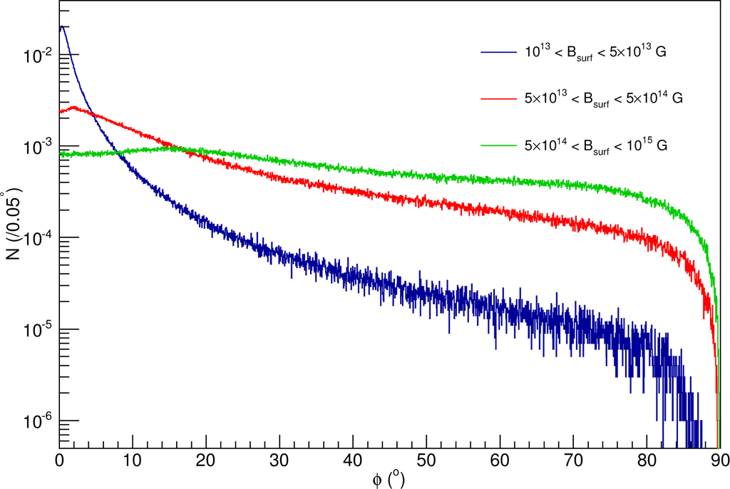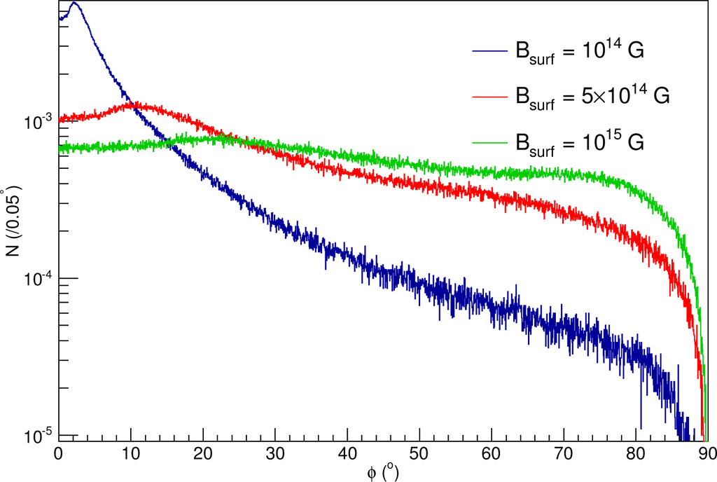 The effect of the neutron star’s surface magnetic field is shown in Figure 6. Here, the surface field of the star is varied while a distribution of angular speeds and radii are simulated. While a higher field will exert a stronger initial torque on the molecules, the steady-state condition of the system for strong fields becomes more significantly affected by the randomly distributed perpendicular components of the field in the reference frame of the meteoroid. Then, the resonant precession frequency of the external field differs significantly from the angular speed of the meteoroid. The polarization distribution is then more strongly affected by the perpendicular components of the field.