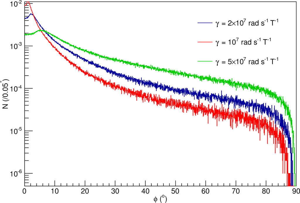 The effects of increasing the molecular gyromagnetic ratios are similar to the effects of increasing the external magnetic fields. While a stronger gyromagnetic ratio will result in a larger external torque on the molecule’s magnetic moment, the torque from the effective field, with a significant contribution from a perpendicular component, will contribute to the overall molecular orientation. This is shown in Figure 7 for Models A, J and K. In the steady state, a smaller gyromagnetic ratio results in a smaller contribution from the random orientations of the angular speed vectors of the meteoroids, and the overall polarization is more randomly distributed. However, even for a fairly large gyromagnetic ratio of 5 × 107 rad s−1 T−1, there is a net polarization parallel to the local magnetic field.