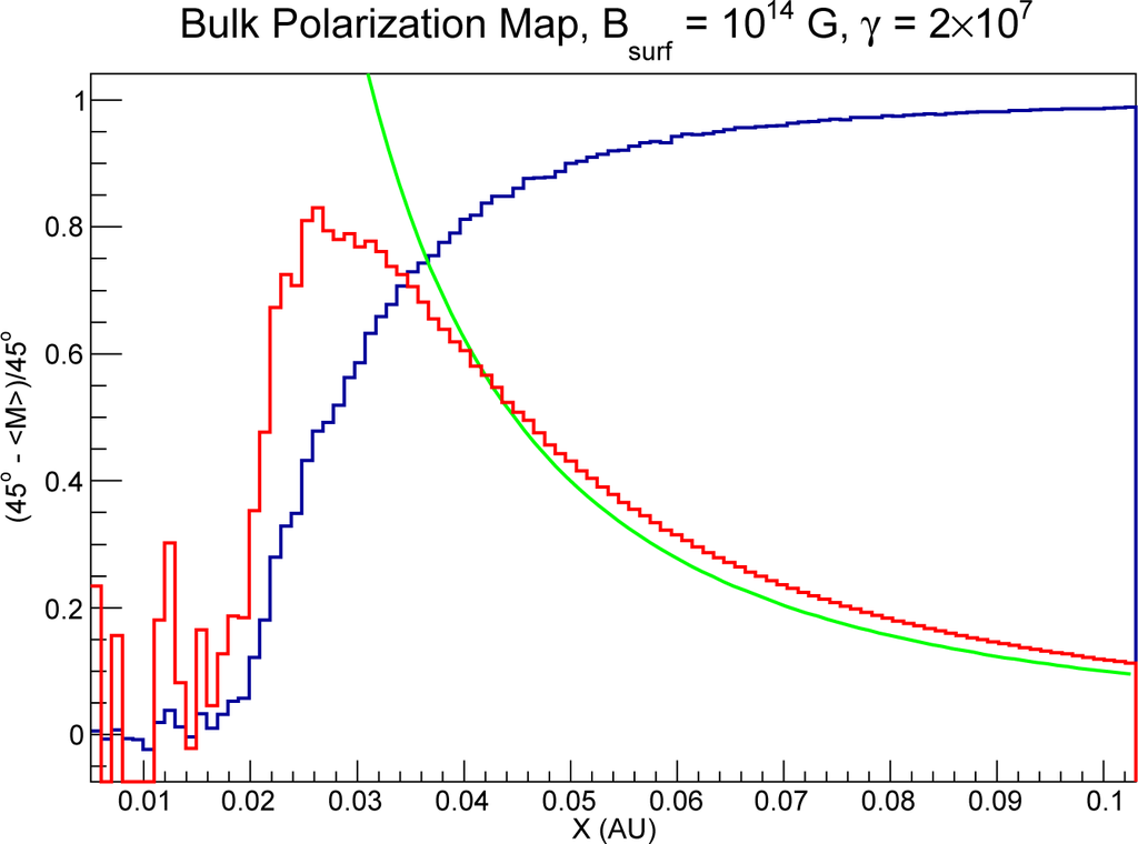 Product of the normalized polarization and 1/r2 for a surface field strength of 1014G and γ = 2 × 107. The black line is the normalized polarization. The green line is the 1/r2 relationship, and the red line is the product of the two. Large fluctuations near 0 AU are statistical.