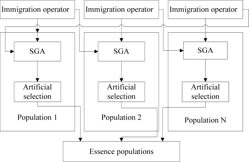 MPGA breaks with the standard genetic algorithm (SGA) framework that relies on the evolution of a single group of genes by introducing multiple populations to optimize the search process. The different populations are assigned with different control parameters to achieve different search purposes. The algorithm also considers global search and local search. Various groups are independent and they communicate with each other via an immigration operator, where an operator regularly (every generation) introduces the best individual obtained from each population in the evolution process into the other populations, thereby achieving information exchange between populations. The specific operation rule requires that the best individual in the source population replaces the worst individual in the target population. During each generation of evolution, the best individual in other populations is selected with an artificial selection operator, thereby preserving the best individuals in the overall population.