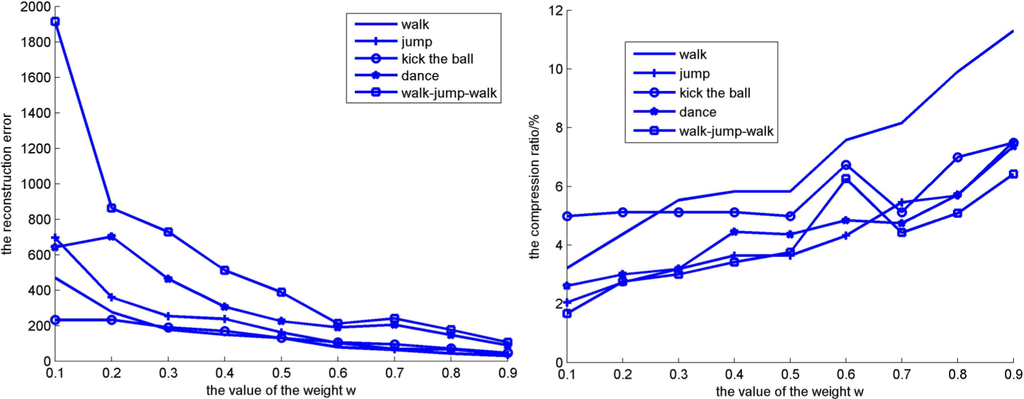 As shown in Figure 3, when the value of the weight w changed, we obtained the corresponding compression ratio and the reconstruction error for the same motion. As the value of the weight w increased, the corresponding reconstruction error decreased and the corresponding compression ratio increased. This is because a smaller reconstruction error indicates higher compression. When the reconstruction error was less than 200 (the value of the weight w was higher than 0.5), the reconstructed sequence was usable. When the reconstruction error was higher, there was a significant difference between the reconstructed sequence and the original motion sequence. Thus, the value of the weight w was selected as 0.5.