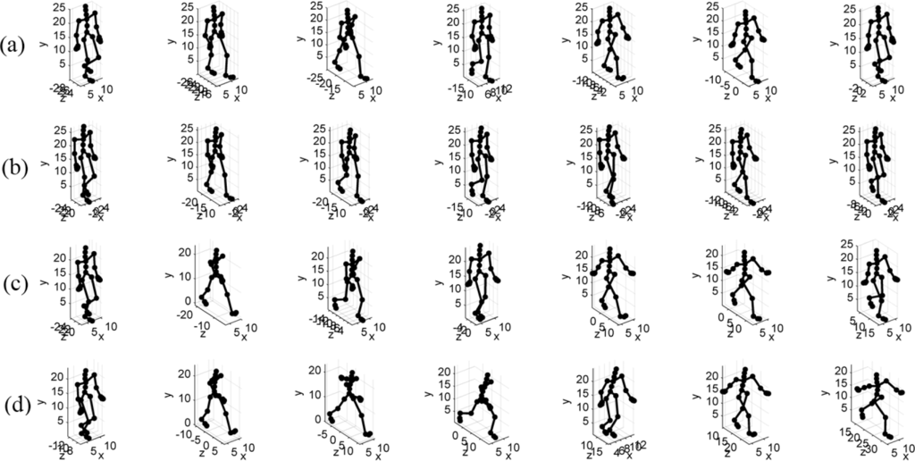 Figure 4 shows that by using MPGA to extract the keyframes from the four types of motion sequences with the same logic but different physical characteristics, the consistency of the keyframe sets was maintained and similar motion sequences were well distinguished.