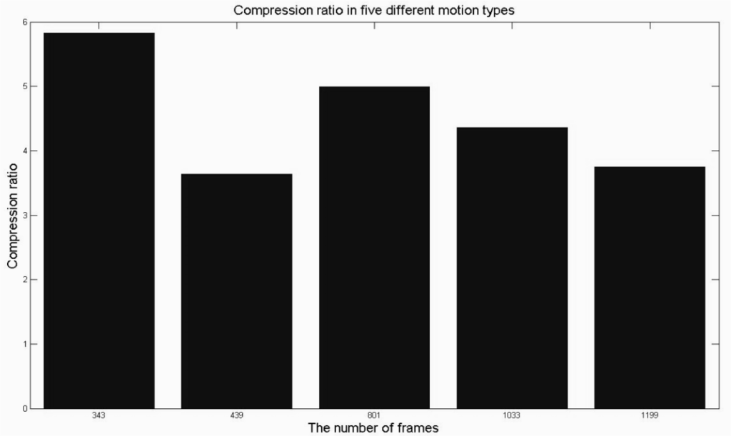Experiment 3. Comparison of the compression ratio and reconstruction error. We tested five different types of motion data, i.e., walking, jumping, kicking a ball, dancing, and walk–jump–walk, where we use the proposed method to extract the keyframes from the different motion sequences. According to the number of keyframes determined by our method, we then used four other methods to extract the keyframes from the motion capture data.