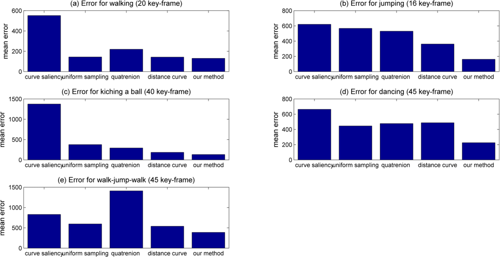 Experiment 5. We also compared the performance of our proposed method and other methods using an irregular exercise, i.e., kicking a ball (801 frames), where the number of keyframes was 40, and the results are shown in Figure 7.