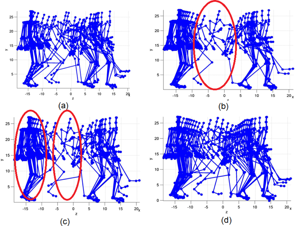 Experiment 2. Comparison of motion capture sequence keyframe extraction from data with different physical characteristics. We selected four types of waking motion data with the same logic (the number of frames was the same, i.e., 129). However, their physical characteristics were different (different speeds and different styles). With the same number of keyframes (seven), the extraction results were as shown in Figure 4.
