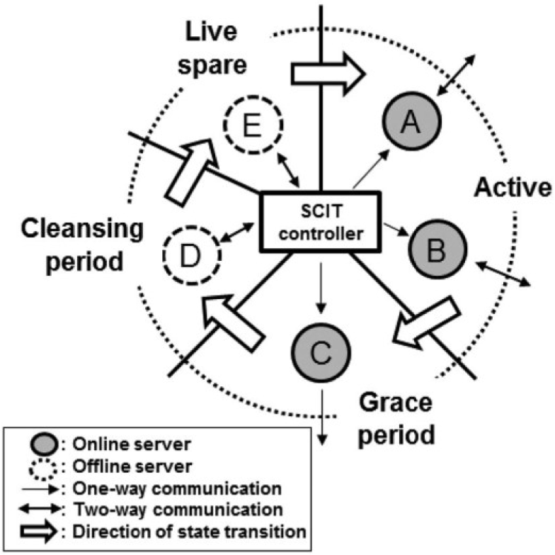Self-cleansing intrusion tolerance (SCIT) [] is a representative study that deploys proactive recovery. The SCIT system is composed of the central controller and redundant servers, which are embodied by VMs as depicted in Figure 1. Applications and services are deployed in VMs. The central controller is responsible for the state transitions of each server. The states are:
