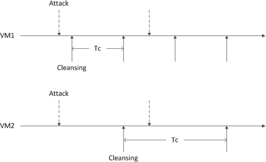 As shown in Figure 2, the attacker who intrudes the VM1 and VM2 will perform malicious activities to collapse the system. Since each VM will be offline periodically and cleansed to remove attacks, the residence time of the attacker is limited by Tc. The damage to VM1, which can be caused by the attacker, is much smaller than to VM2, because Tc of VM1 is half of Tc of VM2 in this example. Therefore, assigning the appropriate exposure time according to λ is essential to improve the security performance of the system.