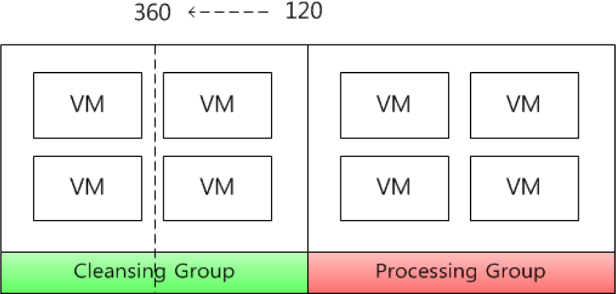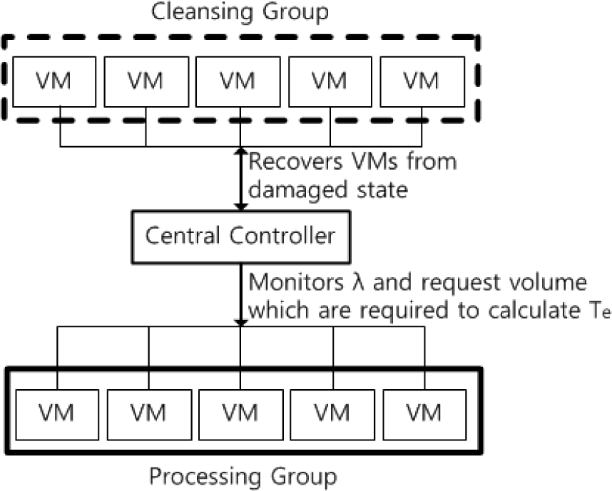 In ERC, the central controller determines the number of VMs, which will process requests according to circumstances. Because the total number of VMs belonging to the whole system is constrained by physical resources, ERC decides the size of two groups: a cleansing group and a processing group.