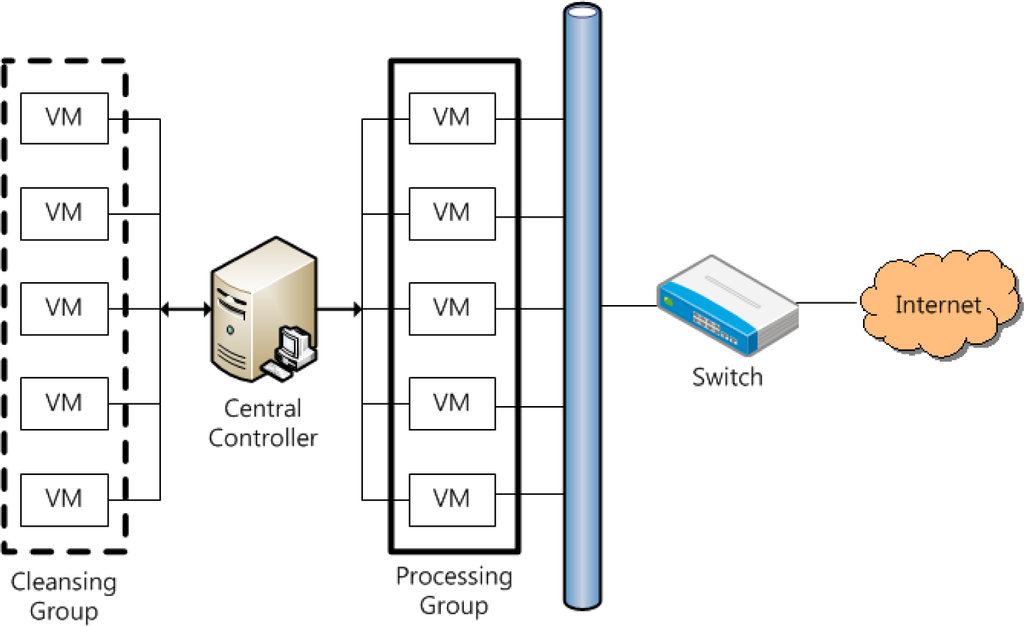 The direction of the arrows indicates the flow of communication. VMs in the cleansing group can communicate with the central controller to restore, whereas VMs in the processing group cannot send messages to the central controller, because they are exposed to the Internet. In prototype, the central controller not only changes the states of VMs as SCIT, but also assigns the exposure time to each VM. Therefore a separation of the internal and external networks is one of the most important techniques to protect the central controller.
