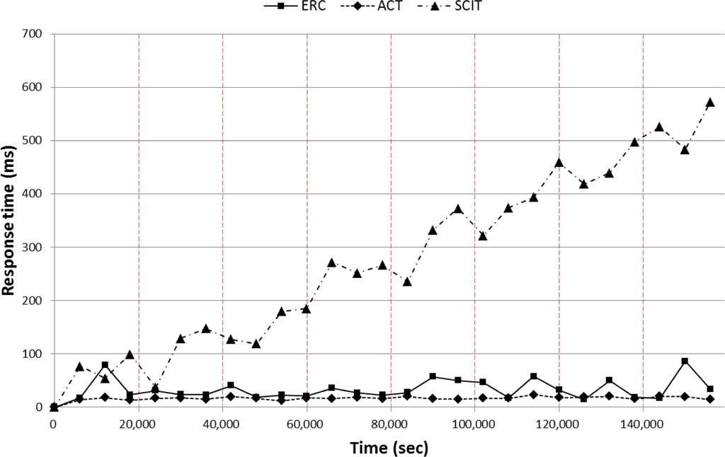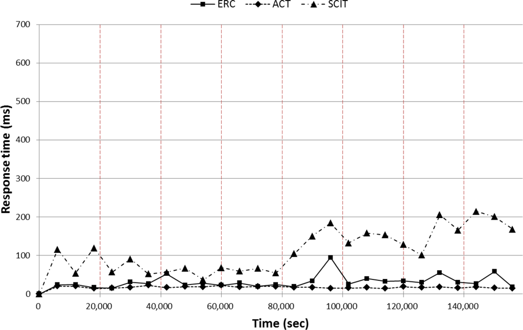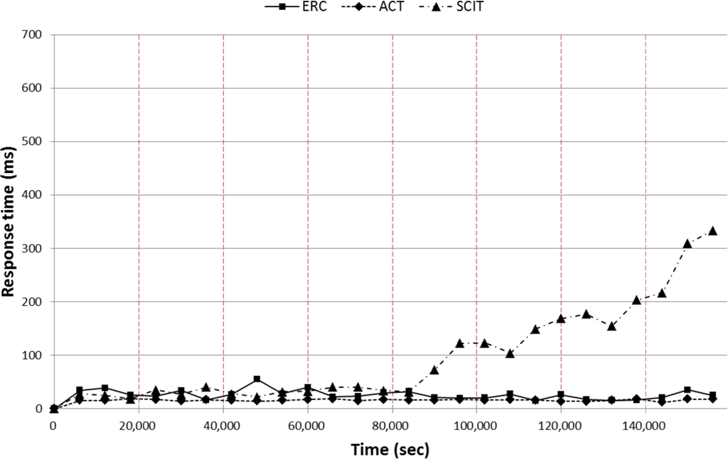 Figure 6 shows the response time of the system based on ERC, ACT and SCIT. ACT transforms the cluster size by periodically checking the whole system’s average response time. The strategy of ACT is well adapted to the condition, and the QoS performance of the system based on ACT is better than ERC and SCIT. However, the number of compromised records is 10 times larger than the other schemes as shown in Table 3, as the cluster expansion causes extension of the exposure time.