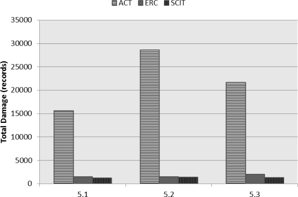 Figure 9 depicts the total damages of the system based on ACT, ERC and SCIT in experiment 5.1, 5.2, and 5.3. The damage done to the system based on ERC is slightly larger than SCIT in all environments. However, the damage is much smaller than that of ACT and the QoS performance gain is large enough to make the gap negligible.