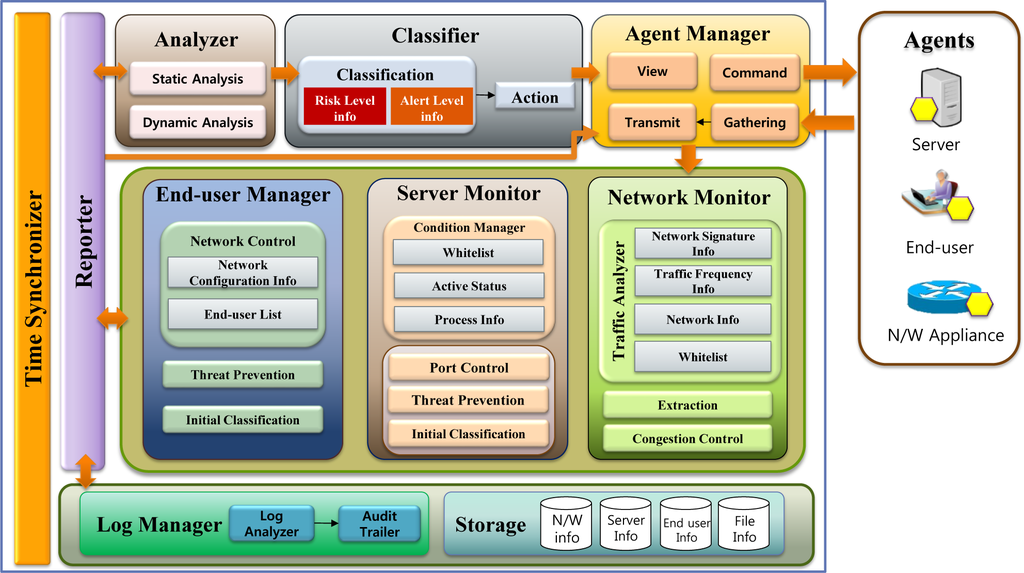 Storage is the module to save the information about network, server and end-user from network monitor, server monitor and end-user manager. It helps in analyzing the malware by transmitting the saved information to other modules when malicious software is detected later.