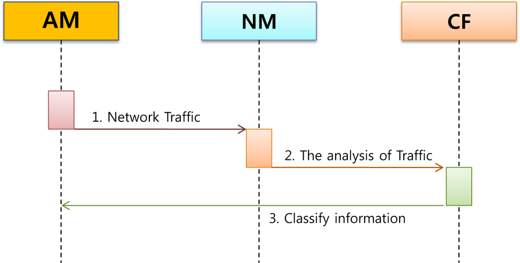 - CF → AM: classify informationWhen certain traffic is classified as malicious by CF, AM is notified to protect the system from APT attacks.