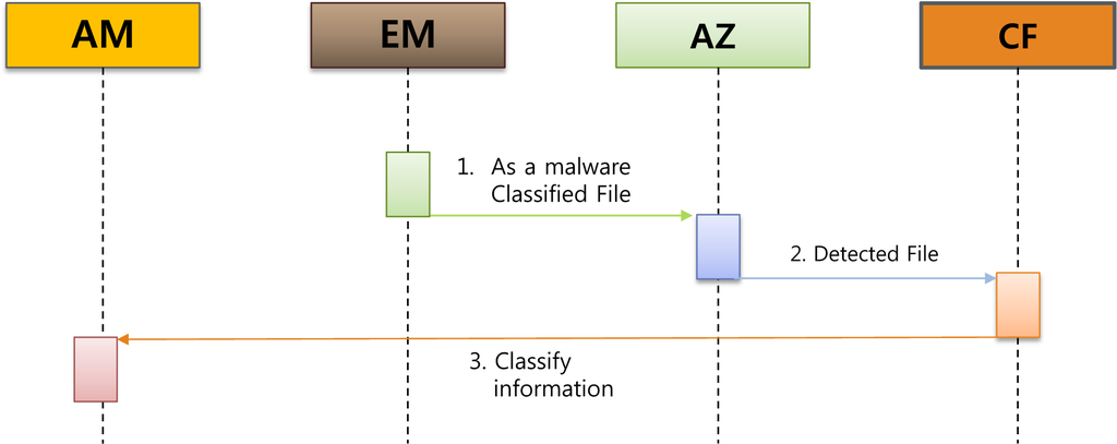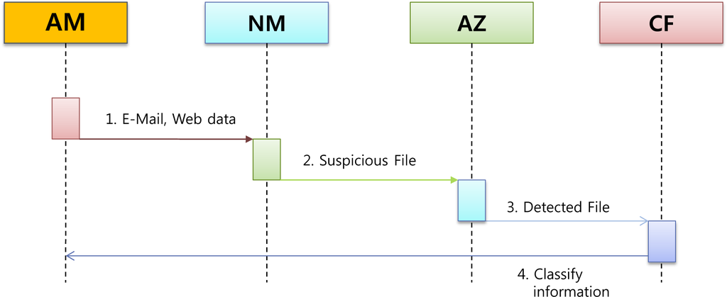 - AZ → CF: sending a detected fileIn the case of those files that are detected for abnormal act, it sends these files to AZ to analyze the presence of malicious files.