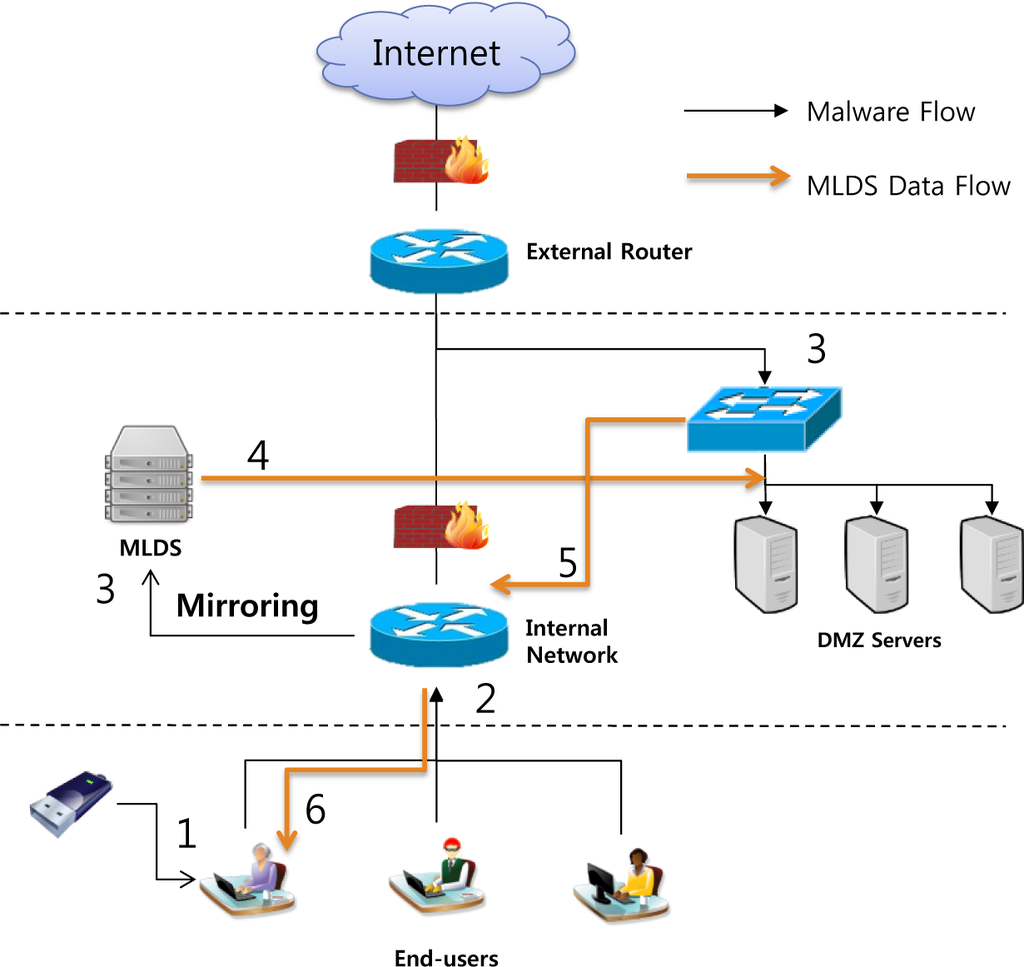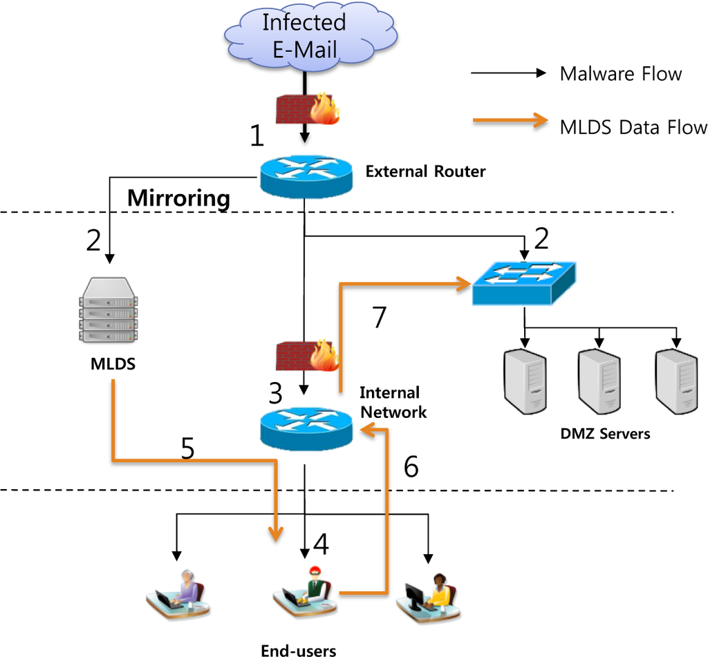 At initial step indicates the flow of infected email to an external router. When an email reaches the inbox it is transmitted from the external router to the DMZ server and mirrored in MLDS simultaneously. The mirrored data starts in advance to conduct analysis in MLDS. At this point, when an end-user tries to read the email, the email will be transmitted to the internal router and then delivered to the end-user. Consequently, the end-user downloads the malware in attached files from email or by visiting the linked web pages. Each time the email is transferred, the log is delivered to the MLDS and continues to conduct the analysis. At this point, if malicious software detects malware file in the end-user, then the MLDS informs the presence of an infection to the end-user and shows the trace of malware through the log information. MLDS removes malware from all devices located in infected path for preventing additional infection through tracking down the infected path of the user. Figure 5 represents the defense scenario of MLDS as to the initial intrusion using spear phishing.