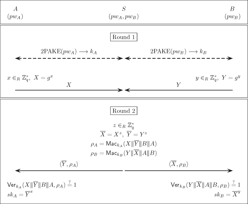 Step 1. A and S establish a secret key kA by running the two-party protocol, 2PAKE. Likewise, B and S establish a secret key kB.