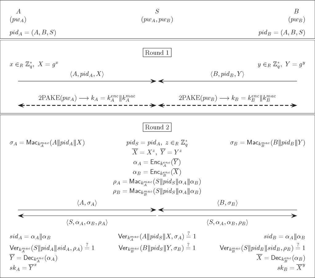 Step 1. A (resp. B) selects a random , computes X = gx (resp. Y = gy) and sends 〈A, pidA, X〉 (resp. 〈B, pidB, Y〉) to S.