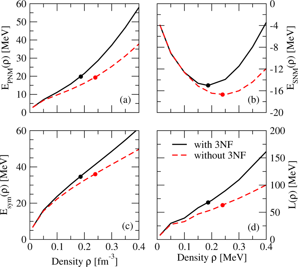 The discussion of our results starts by showing in Table 1 the bulk parameters characterizing the density dependence of the energy of SNM and the symmetry energy around saturation density. Results are shown for calculations with and without 3NF. Note that, in general, the effect of the 3NF seems to be more important on the isoscalar properties than on the isovector ones. In fact, by looking at the table it seems that the parameters L, Ksym and Qsym describing the density dependence of the symmetry energy around saturation are little affected by the effect of 3NF. However, we should notice that the value of the saturation density is different when 3NFs are considered (ρ0 = 0.187 fm−3) or not (ρ0 = 0.240 fm−3) in the calculation. Therefore, one has to be careful when comparing the value of these parameters in the two cases. To clarify the role of 3NF in the isovector properties of the nuclear equation of state, we show in Figure 1 the energy per particle of PNM (panel a) and SNM (panel b), as well as the symmetry energy (panel c) and its slope parameter (panel d), defined as L(ρ) = 3ρ∂Esym(ρ)/∂ρ, as a function of the density. The circles show the results at saturation density. As expected in the low density regime the role of 3NFs is basically negligible. Overall, for densities in 0.1–0.3 fm−3, there is a moderate dependence of Esym(ρ) and L(ρ) on the 3NF, even though its effect on PNM and SNM is not small. This dependence becomes stronger and stronger when increasing the density. The importance of 3NFs has been recently revised in the context of chiral effective field theory [29–34]. New fitting protocols of two-nucleon forces seem to indicate that the effect of 3NF could actually be rather small in PNM. Nevertheless, the relative importance of the two- and three-body contributions changes with the resolution scale. It is not clear whether such observations, valid for somewhat soft chiral interactions, still apply when considering a harder interaction like Av18.