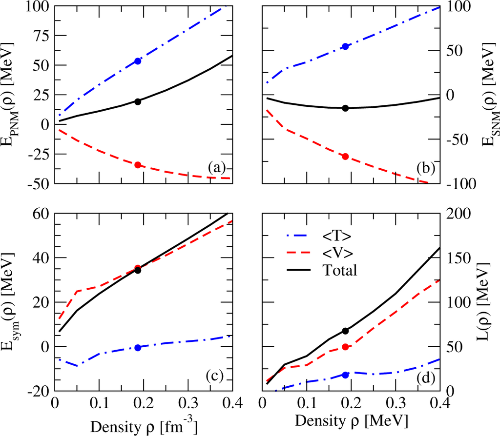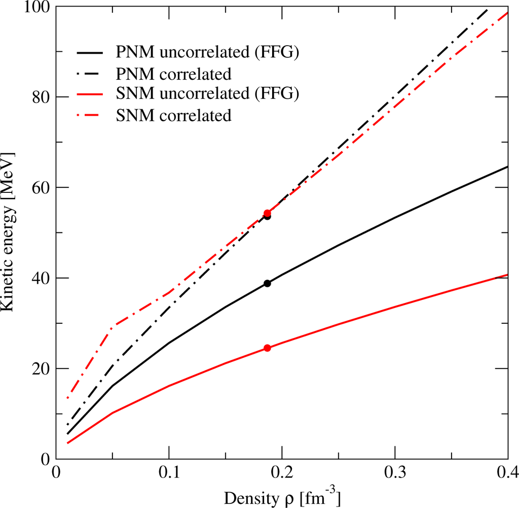 As in the case of the deuteron, both the total energy of PNM and that of SNM are the result of a strong cancellation between the kinetic and potential energies. It is worth noticing that the kinetic energy contribution to Esym is very small in the whole density range, being slightly negative for ρ ≤ 0.2 fm−3. This is in contrast to the results for the FFG (see Figure 2 and Table 2). The increase of the kinetic energy with respect to the FFG energy is probably due to the strong isospin dependence of the short-range NN correlations (SRC) induced by the tensor force. This observation has been also recently pointed out by Xu and Li [41] and Hen et al. [42] using a phenomenological model for the nucleon momentum distribution n(k), and by Carbone et al. [43] using the self-consistent Green’s function approach with the Av18 and the CDBONN [44] potentials. To illustrate this point, we show in Figure 4 the kinetic energy of uncorrelated (i.e., FFG energy) and correlated PNM and SNM as a function of density. Results at saturation density are also shown in this case by the circles. It can be seen that the increase of the kinetic energy of SNM due to SRC is always much larger than that of PNM. This is an indication that, at the same fixed density, SNM is always more correlated than PNM. Note also that the kinetic energy of both correlated systems is of similar order and that their strong cancellation gives the almost negligible contribution to the kinetic part of Esym noticed before. It is also worth mentioning that the kinetic contribution to L is smaller than the corresponding one of the FFG in the full density range. Clearly, the major contribution to both the symmetry energy and its slope parameter is due to the potential energy part. Note that at saturation density (see Table 5) this contribution is practically equal to the total value of the symmetry energy at saturation, and it represents ~78% of L.