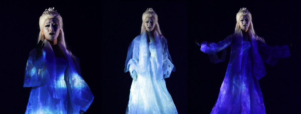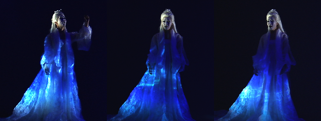 Then, particular musical scenes applying our system were rehearsed. In this scene, two characters appeared, and one’s dress was augmented to look like a ghost decorated by our system. Although the actress kept moving frequently, the images were projected onto and combined with her dress accurately in real-time, as shown in Figures 4 and 5. The actress did not have any difficulty in performing with our system, since she did not need to act differently and nothing needed to be changed from the original movement.