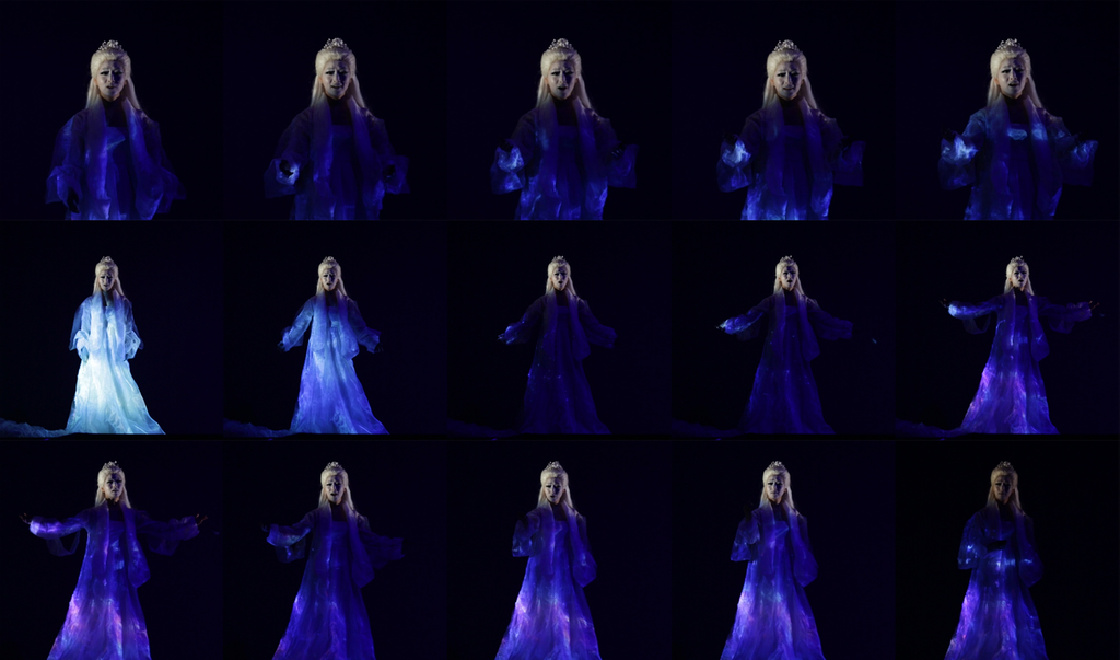 Initially, while the actor keeps standing at one position and spreads his arms out horizontally, we precisely calibrated the imagery on the actor’s costume. This calibration performs image transformations through adjusting the size and the location of the projection, and then accurate silhouettes are generated through morphology and blurring operations. Then, a particular scene was rehearsed according to the planned direction while recording with a camera in front of the stage. Finally, the recorded video was analyzed. In the recording, we selected a portion with the largest actor’s movement. When the actor stopped moving, we counted the frames until the images were aligned with the actor’s costume.