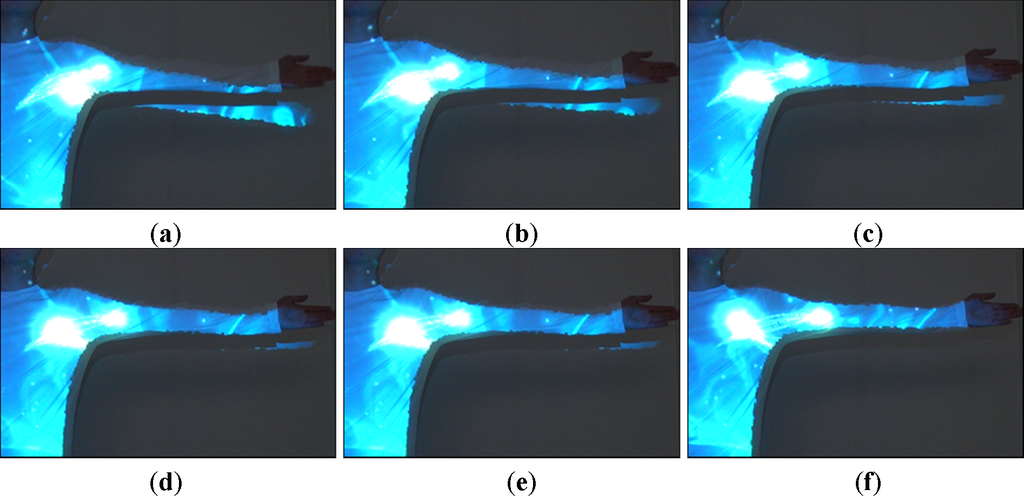 With this method, the result presented that the images are aligned exactly after five frames; which means that approximately 0.167 s latency occurred. If we calculate the aligning time for all the frames in the scene, our system shows lower average latency. Our system was tested on a personal computer (PC) with Intel core i7-3770 3.50GHz CPU, NVIDIA GTX680 GPU, 16GB RAM (Customized PC); Point Grey FIREFLY® MV IR camera (Point Grey Research, Richmond, Canada); and EPSON EB-G5950 high-lumen projector (Seiko Epson Corporation, Suwa, Japan).
