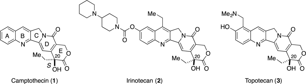 Camptothecin (CPT 1, Figure 1), which was isolated from Camptotheca acuminata by Wani and Wall in 1966 [1], exhibits potent antitumor activity by inhibiting DNA topoisomerase I (Topo I) [25]. To date, two camptothecin analogues, i.e., irinotecan (2) [69] and topotecan (3) [1012], have been approved by the FDA to treat cancers. Structurally, CPTs contain a pyranoindolizine tricyclic structure (the C-D-E ring system) with a tert-hydroxyl group at C20, and the stereochemistry at C20 is important for their biological activity. Thus, stereoselective construction of this tert-hydoxyl group is an important issue in the synthesis of CPTs.