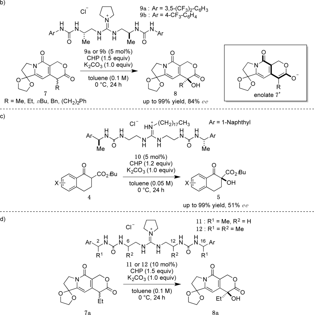 Recently, we have reported α-hydroxylation of tetralone-derived β-ketoesters 4 using cumene hydroperoxide (CHP) in the presence of guanidine-bisurea bifunctional organocatalyst 6 (Scheme 1a) [13]. In this reaction, the guanidine group and urea group were suggested to interact with the enolate of tetralone and the oxidant CHP, respectively. Based upon the proposed transition state model, we further applied this reaction to the α-hydroxylation of pyranoindolidine derivatives 7 to obtain the corresponding hydroxylated compounds 8 via the extended enolate 7′ with high enantioselectivity (Scheme 1b). The products 8 are key synthetic intermediates in the Friedländer condensation approach to CPT derivatives [1422]. Subsequently, we developed the novel guanidine-bisurea bifunctional organocatalyst 10 (Scheme 1c) bearing a chiral center at the outer side of the urea groups [23]. Although it is conformationally more flexible than 6, we found that 10 catalyzed the α-hydroxylation of tetralone-derived β-ketoesters 4 with moderate enantioselectivity. Moreover, the catalyst 10 lacks a CF3 group in the Ar moiety, which had been believed to be mandatory for effective activation of the oxidant; nevertheless, the catalyst 10 gave the oxidative product 5 in excellent yield. Therefore, we set out to examine the effect of chirality at the outer side of urea in the newly designed catalyst 11. Herein, we described α-hydroxylation of pyranoindolidine derivative 7a in the presence of catalyst 11 bearing a chiral center at the outer side of the urea groups. We also examined the effectiveness of catalyst 12 possessing chirality at both the inner and outer sides of the urea groups (Scheme 1d).