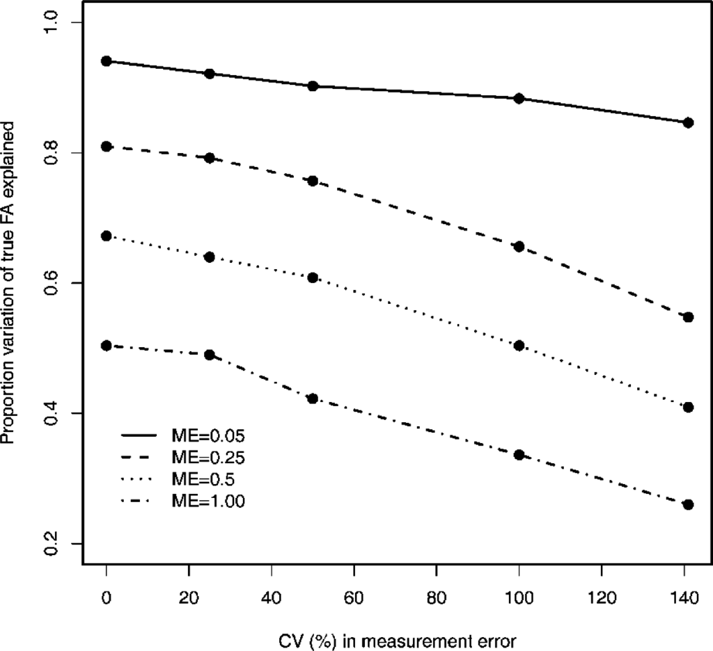 As expected, the coefficient of determination of the regression analysis of the estimated (uncorrected for variation in ME) and true underlying individual asymmetries decreased with the increasing degree of measurement error (Figure 1). In addition, coefficients of determination decreased with increasing between-individual variation in ME. This decrease was strongest and of similar magnitude when the average level of ME equaled 0.25 or more (Figure 1). Finally, the decrease was relatively small when the coefficient of variation of between-individual variation in ME equaled 25%, but became stronger for values of 50% and higher (Figure 1).