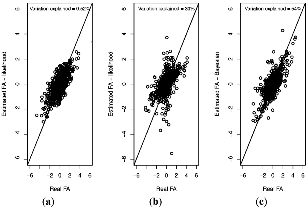 The reason for this decrease can be found in Figure 2. The left panel shows the association between the true and estimated asymmetries in the absence of between-individual variation in ME, where the level of ME and FA were equal to one (i.e., using the appropriate mixed regression model [9]). The observed coefficient of determination equaled 0.52 (Figure 2). Introducing between-individual variation in ME (CV = 100%) in the simulation of the data, but ignoring this in the estimation of individual asymmetries (again, using the mixed regression model [9], which is now not appropriate) resulted in a much smaller coefficient of determination (i.e., r2 = 0.30; see also Figure 1), apparently mainly as a consequence of a limited number of asymmetry estimates being largely under- or over-estimates (Figure 2). These observations correspond to individuals with relatively high ME (values not shown). However, applying the Bayesian model developed in this paper resulted in a coefficient of determination similar to the one obtained in the absence of between-individual variation in ME (i.e., r2 = 0.54) (right panel in Figure 2), and the plot did not show such large over- or under-estimates of individual asymmetry values (Figure 2). It can therefore be concluded that the newly proposed model leads to unbiased estimates of individual asymmetry in the presence of variation in measurement error.