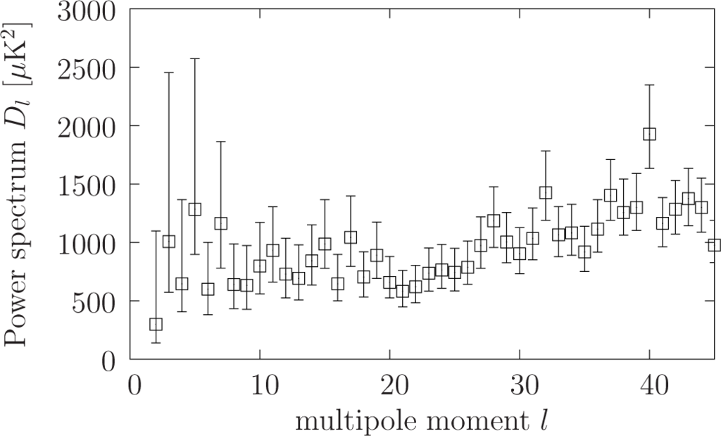 The cosmic microwave background (CMB) is an observed uniform thermal black-body radiation of a present temperature of 2.725 Kelvin with a peak frequency of 160.2 GHz, discovered in 1964 by A. Penzias and R. Wilson [28]. According to big bang cosmology, its origin is dated back to the early epoch of photon decoupling, when neutral atoms were formed at very high density and temperature. Its amplitude today is observed by the Wilkinson probe and up to 2013 by the Planck satellite [29]. After a non-trivial cleaning of the measured temperature for global astrophysical influences, such as the Wolfe–Sachs effect and the local foreground of the solar system and our galaxy, the CMB spatial temperature fluctuations are expanded in multipoles, shown for the lowest values of l in Figure 4.