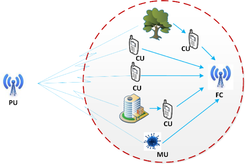 We consider a cognitive radio network as shown in Figure 1 that consists of N CUs, of which l CUs may experience fading or the shadowing effect and M (M << N) CUs are malicious users (MU). We assume three types of malicious users: always present (AP), always absent (AA) and always different (AD). In the first two types, malicious users always send a high or low signal, respectively, regardless of the actual status of the PU, whereas in the last type, the malicious user always sends an opposite signal of PU status. We assume an error-free common control channel between CU and FC. We use the soft fusion rule, where each CU reports its observation to the fusion center in m bits.