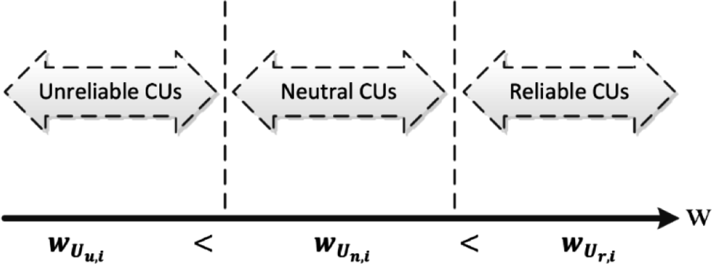 The CUs are classified into reliable, neutral and unreliable categories on the basis of local decisions, partial global decisions and global decisions, i.e., DL,i, DG,i and DG, as below.