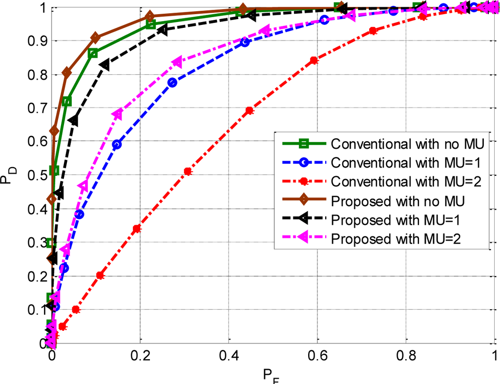 Figure 4 shows the performance comparison of our proposed scheme and the conventional CSS scheme in terms of the ROC under the effect of zero, one and two malicious users (AD type). It is clear from the figure that as the number of malicious users increases, the detection performance of both schemes decreases. When there is no malicious user among the CUs, the gap between the performance curve of our proposed approach and the conventional CSS is minimum. In this case, our approach performs slightly better than conventional CSS. By introducing malicious users (i.e., one or two), the gap between our proposed and conventional CSS is increased due to the more severe effect by MUs on conventional CSS. Our proposed approach minimizes the effect of MUs by judiciously categorizing the CUs into reliable, neutral and unreliable categories and assigning them weights accordingly. The effect of malicious users is suppressed by assigning low weights to them, which makes our proposed approach more robust and efficient.