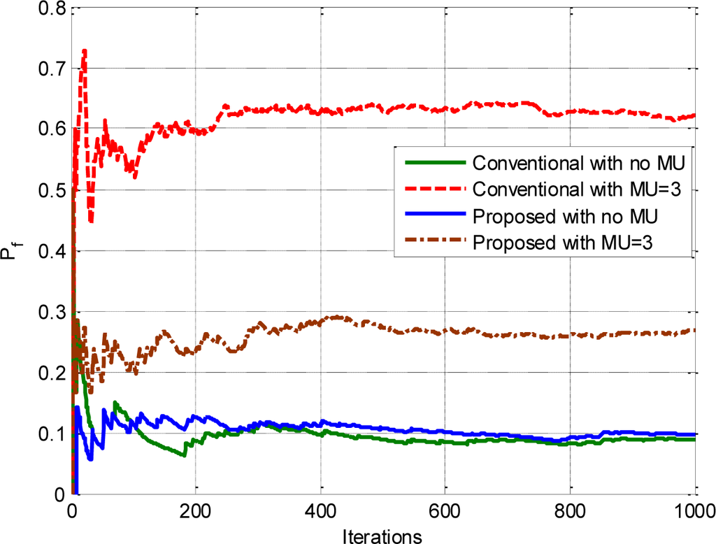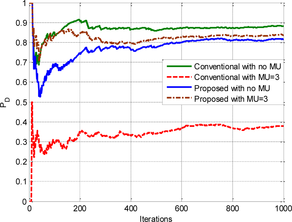 Figure 5 shows a comparison of the detection probability of our proposed scheme with the conventional CSS in the presence of no and three malicious users (one of each type), respectively. It is evident from the figure that the detection probability of conventional CSS drops to an unacceptable level (below 0.8) in the presence of malicious users, whereas the detection probability of our proposed approach maintains a stable and acceptable level (above 0.8) as the number of iterations increases after experiencing a slight initial degradation. The decreased detection probability occurs due to the presence of AF and AD types of malicious users on which conventional CSS has no control, whereas our proposed approach restricts them by properly placing in the unreliable category and assigning low weight coefficients.