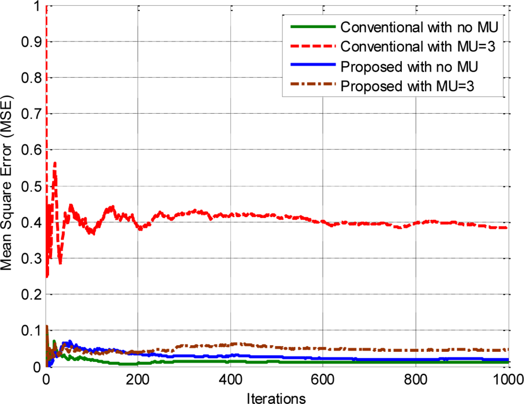 It can be observed from the figure that when the network is free of malicious users, both schemes show almost similar mean square error, but when malicious users are introduced into the network, then the error of conventional CSS becomes significantly greater than that of our proposed approach. The increased value of error in conventional CSS occurs due to high misdetection and high false alarm probabilities.