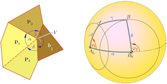 As a preparation, we provide a necessary condition for flexible polyhedral surfaces with two flat flexions. This condition refers to vertices V where four faces are meeting. Let α, β, γ and δ be the sequence of interior angles at V. Under the “vertex figure” of V, we understand the intersection of these four faces with a sphere, which is centered at V and whose radius is smaller than the shortest edge with endpoint V. Hence, the vertex figure is a spherical quadrangle with sides of lengths α, β, γ and δ (Figure 2). It has no effect on the flexions of this spherical quadrangle, when we replace any side of length λ by its complementary arc of length 2π − λ. Therefore, we can confine ourselves to the case α,…,δ < π; we call this quadrangle the reduced vertex figure.