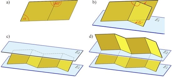 After iterated reflections in planes E2 parallel to E1 (Figure 4d) or after translations orthogonal to E1, the complete Miura-ori flexion is obtained as depicted in (Figure 5). When finally the two initial parallelograms become coplanar due to a bending angle of 180°, Miura-ori reaches a totally folded pose, which is again flat.