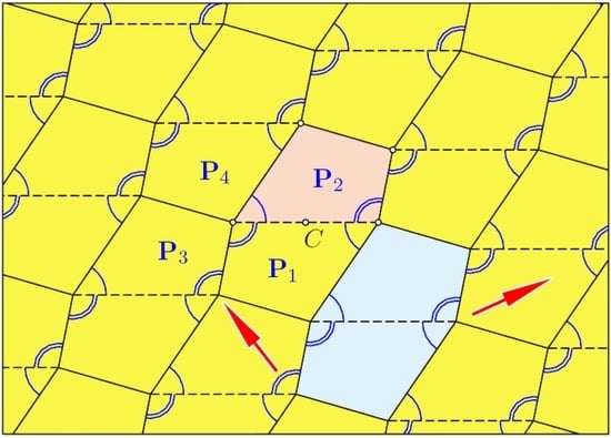 Now, we can extend this flexion of the pyramid step by step to the complete tessellation: the rotation ρ1 exchanges not only P1 with P2, but transforms the pyramid with apex V1 onto a congruent copy with apex V2 sharing two faces with its preimage. This is the area hatched in green in Figure 8, right. Analogously, ρ4 generates a pyramid with apex V4 sharing the faces P1 and P4 with the initial pyramid. Finally, there are two ways to generate a pyramid with apex V3. Either we transform ρ2 by ρ1 and apply ρ1 ○ ρ2 ○ ρ1, which exchanges V2 with V3, or we proceed with ρ4 ○ ρ3 ○ ρ4, which exchanges V4 with V3. Thus, we obtain two mappings, ρ1 ○ ρ2 and ρ4 ○ ρ3, with V1 ↦ V3, which are equal by virtue of Equation (3). Hence, each flexion of the initial pyramid with apex V1 is compatible with a flexion of the 3 × 3 complex of quadrangles. This can be extended to the complete tessellation (in [], it is shown that this tessellation is a particular case of the line-symmetric Type 5 of flexible Kokotsakis meshes).