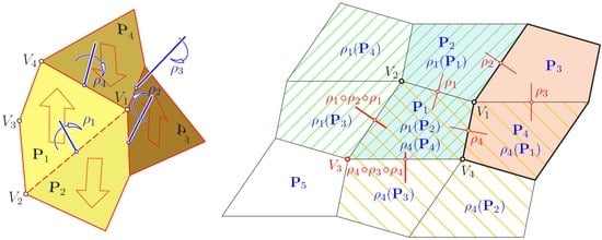 According to the labeling in Figure 8, left, for any pair of adjacent faces, there is a respective 180°-rotation (“half-turn”) ρ1, ρ2, ρ3 or ρ4, which exchanges the two faces. Therefore, e.g., P2 = ρ1(P1). The axis of ρ1 is perpendicular to the common edge V1V2 and located in a plane that bisects the dihedral angle between P1 and P2.