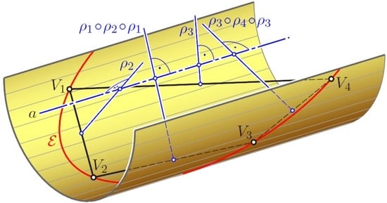 Once we have clarified that for each non-planar flexion, all vertices lie on a cylinder Ψ of revolution with axis a, we can give another explanation for the flexibility (see Figure 10): the plane spanned by the quadrangle V1…V4 intersects the circumcylinder Ψ along an ellipse E. Given a convex quadrangle V1…V4, there is a pencil of conics passing through the four vertices. This pencil includes an infinite set of ellipses, which is bounded by parabolas or pairs of parallel lines. Hence, we can specify an ellipse ε out of this pencil and choose one of the two right cylinders passing through ε.