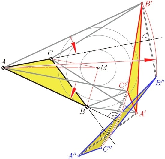 Proof. In order to obtain the second flat pose, let us keep the face ABC fixed, while the opposite triangle A′B′C′ is replaced by a congruent copy A″B″C″. Both flat poses must show respectively equal distances AB′ = AB″, AC′ = AC″,…, CB′ = CB″. We show that the reflection in the line AB maps C′ onto C″, the reflection in the line AC maps B′ onto B″ and the reflection in the line BC maps A′ onto A″ (see Figure 14). Firstly, these reflections preserve the distances to the points of the fixed triangle. Secondly, since both pairs of lines, (AB, AB′) and (AC, AC′), are symmetric with respect to AM, the angles ∢B′AB″ = 2 ∢B′AC and ∢C′AC″ = 2 ∢C′AB are equal. Hence, there is a rotation about A, which sends the side B′C′ onto B″C″ and preserves the length. The same holds for the other sides A′B′ and A′C′. □