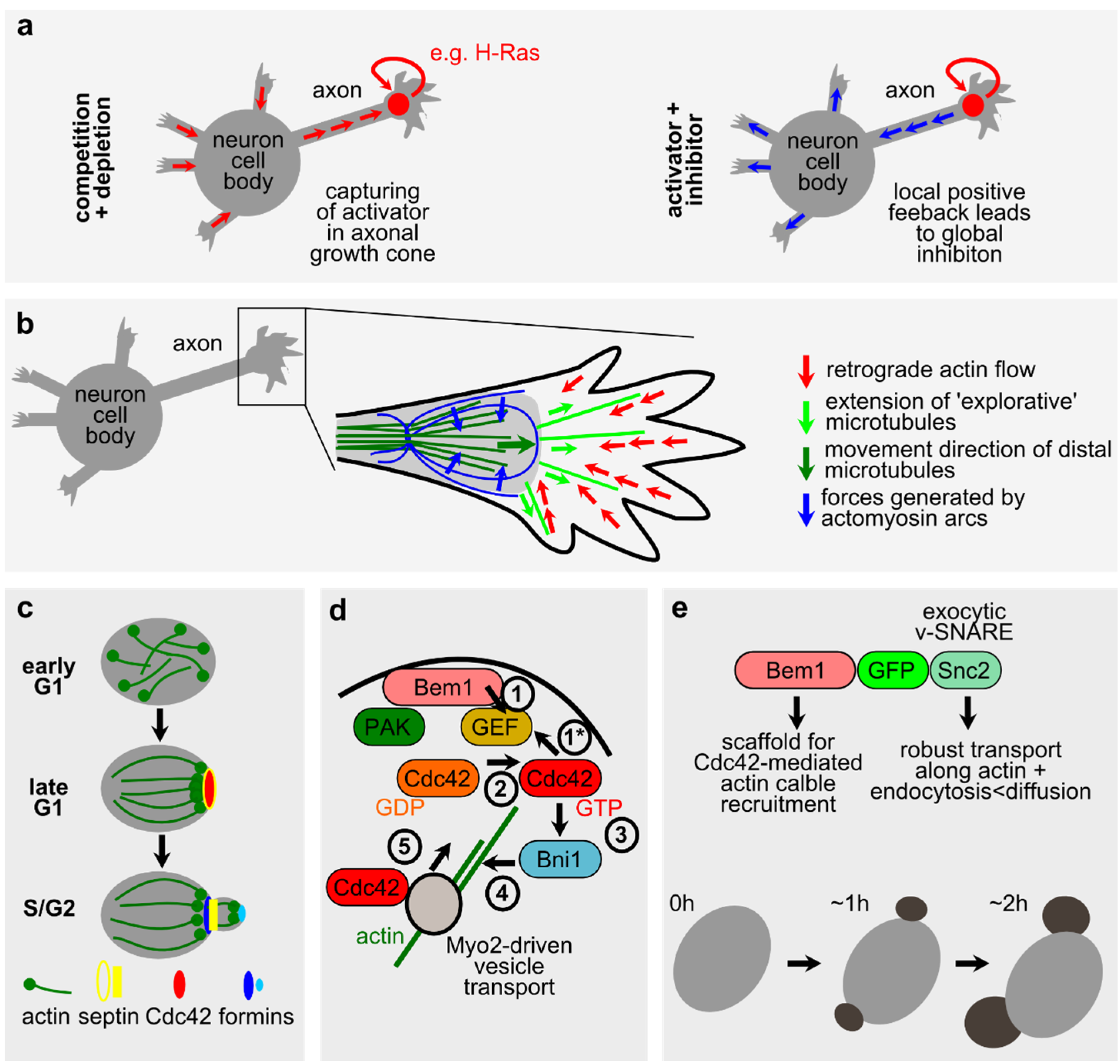 How to generate a singularity in neurons and in S. cerevisiae. (a) Models that explain the generation of a single axon. Adapted from [128]; see text for details; (b) Actomyosin-dependent remodeling of axonal microtubules. The enlarged area shows a schematic that summarizes dynamics during growth cone advancement. Adapted from [70]. In the peripheral domain of the growth cone (right), dynamics microtubules (green arrows) polymerize parallel to filopodial actin filaments that are subject to retrograde flow (red arrows). Therefore, peripheral microtubules cannot reach filopodial tips. Slowing of retrograde flow (not shown) and centripetal forces generated in actomyosin arcs (blue arrows) lead to opening of the central zone (depicted in grey) and microtubule advancement; (c) Cell division in S. cerevisiae. Note the re-structuring of actin cables and the formation of a bud site that contains Cdc42. At this site, also the septin ring forms (see [12] for details); (d) Positive feedback leads to enrichment of Cdc42 at a single site during budding. Schematic adapted from [12]. Cortically bound Cdc42-GTP (bound through stochastic events, (1*) can recruit the cytoplasmically assembled complex of the scaffold protein Bem1 with PAK (Cla4/Ste20) and a Cdc42 guanine nucleotide exchange factor (GEF) (Cdc24) (1). GEF activity leads to local enrichment of Cdc42-GTP (2), thereby establishing positive feedback. Higher amounts of Cdc42-GTP promote recruitment and activation of the formin Bni1 (3) that leads to the capture/formation of actin cables (4). Along actin cables, vesicle-bound Cdc42 can be transported (using the myosin motor Myo2, (5)). This will lead to further enrichment of Cdc42 and start a second positive feedback; (e) Fusion of the scaffold Bem1 to the exocytic v-SNARE Snc2 (top) can lead to the simultaneous formation of two buds (bottom, dark grey). See text and [6] for details.