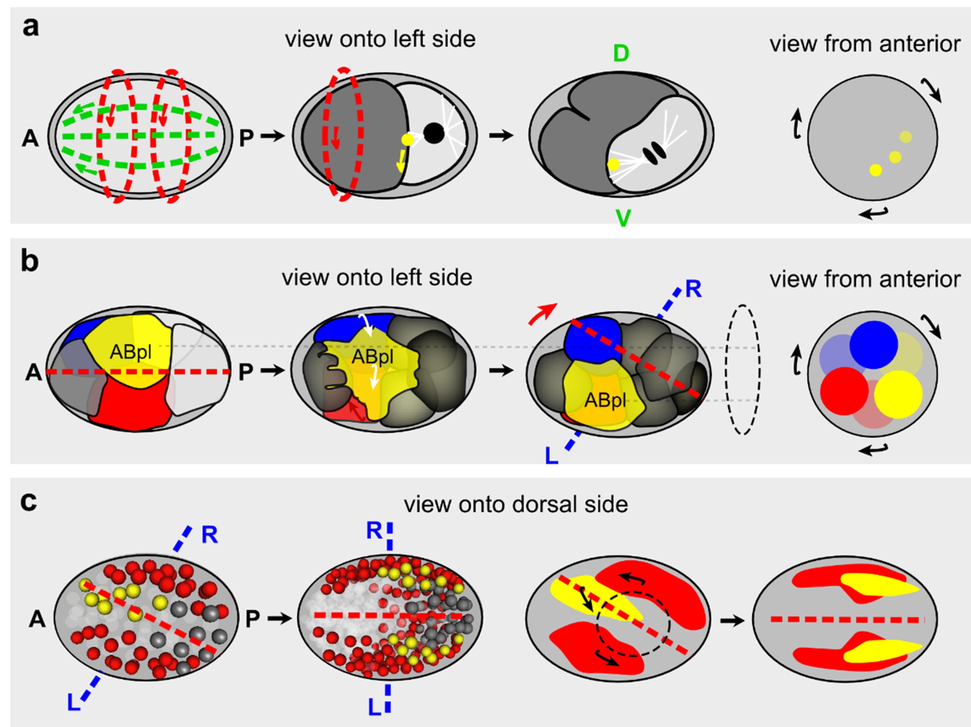 Chiral processes that mediate axis formation and anteroposterior (L/R) asymmetric patterning. (a) Before dorsoventral (D/V) axis formation starts, cortical rotation can be observed in the C. elegans embryo (left). This has been interpreted as a first sign of cellular chirality [188]. Cortical rotation occurs again during the next division and re-positions the cell division remnant of the first division (yellow) asymmetrically onto the future ventral side (middle). Due to persistent spindle-cell division remnant interactions, the spindle in the posterior cell (white lines) is also skewed ventrally, thereby generating the invariant configuration of the 4-cell embryo [192,193]; (b) After spindle skewing during the L/R divisions of the two ectodermal founder cells ABa and ABp (see Figure 5a), a chiral morphogenetic process starts (left): The left daughter of ABp, ABpl changes its shape due to differential regulation of cortical actomyosin, and migrates ventrally (middle). Due to asymmetric cell-cell contacts, this leads to a clockwise rotation of cells when viewed from anterior (right); (c) During most of gastrulation, the embryo uses a skewed midline (dashed red line) for asymmetric L/R inductions. Gradually, bilaterally symmetric lineages (red and yellow) undergo a chiral, coordinated transition into a symmetric configuration. See text for details.