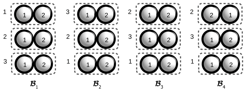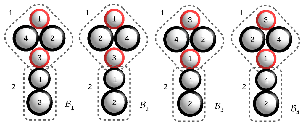 Since spheres within rigid bunches of an assembly system could be identical and bunches could be identical, as well, the underlying symmetry groups could be of large order, which grow with the number of participating spheres and bunches. Therefore, all of the tasks in the previous three subsections can be significantly simplified by taking advantage of natural symmetries of the configuration space that arise due to identical assembling units, their symmetries and symmetries of the final assembled structure. However, none of the prevailing methods discussed above computationally incorporates these symmetries. Group theory has been used to study the symmetry of molecules and molecular orbits [50,51,52,53] for a long time. The well-known Pólya enumeration theorem [54], which provides a method to find the number of orbits of a group action, is motivated by the problem of enumerating permutational isomers of a given molecular skeleton. Group theory is widely used in crystallography to describe crystallographic symmetry and to classify crystal structures [55,56]. Other applications include using the molecule symmetry group in studying molecular spectroscopy [57] and using generating functions in understanding nuclear spin statistics of nonrigid molecules [58]. However, most of these works only involve the symmetry of individual structures. The literature is sparse in the context of symmetry in assembly systems or in configuration spaces.