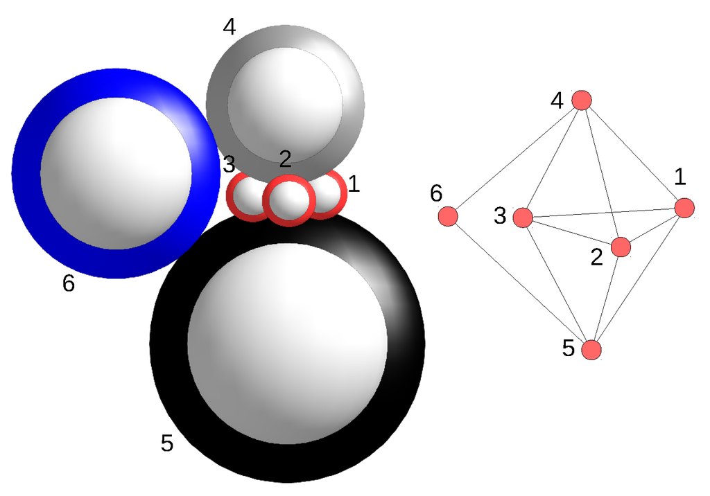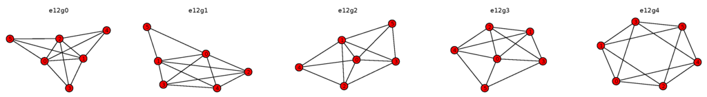 All non-isomorphic active constraint graphs with 12 edges of an assembly system of six bunches that are identical singleton spheres. The label on top is automatically generated by EASAL and specifies the orbit number of the shown active constraint graph.