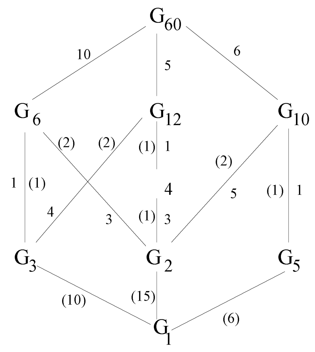 - Pólya, G.; Read, R.C. Combinatorial Enumeration of Groups, Graphs, and Chemical Compounds; Springer-Verlag New York, Inc.: New York, NY, USA, 1987. [Google Scholar]