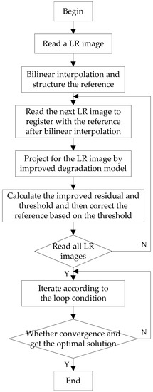 - Read the remaining LR frames to register with the reference frame after bilinear interpolation, and estimate the motion between each frame and the reference frame to produce the registration mapping parameters.