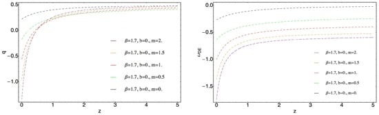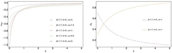 Consideration of the non-interacting model implies Q equal to 0 in Equations (17) and (18). In this case the first cosmological parameter which was studied is the deceleration parameter q (Figure 1) and one sees that for appropriate values of parameter m one can obtain a transit universe. Moreover, it can be seen that (when ) decrease of m causes vanishing of possibility to have a transit universe, in particular, when , which corresponds to the usual ghost DE case, the transit universe is not possible. One can see that suggested modification allows to make the model very flexible with respect to future observational data. On the other hand, the graphical behavior of the deceleration parameter q and known fact that , imposes some constraints on parameter m. In particular, for this model the following constraint on m will be obtained. Moreover, the right plot of Figure 1 demonstrates that for appropriate values of parameters, the phantom divide crossing is also possible. Figure 2 represents the graphical behavior of EoS parameter of the total effective fluid defined as