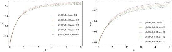 In Figure 3 the redshift dependent behavior of the deceleration parameter q and EoS parameter of the varying ghost DE, Equation (32), corresponding to different values of the parameter b for fixed values of β and m are plotted. It can be seen, that the considered sign changeable interaction, Equation (46), leaves unaffected the transition redshift and a distinguishing interacting models from non interacting is not possible. An estimation of the present day values of and for this model gives the same picture (for small values of b). The considered model is a model of a universe where